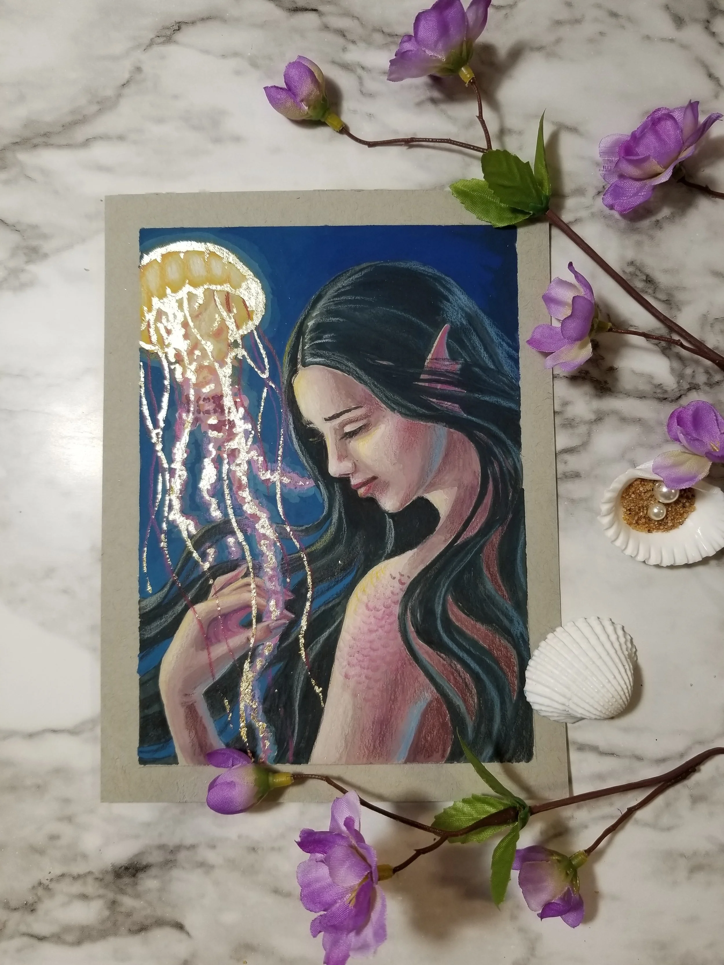A mermaid befriends a jellyfish. I had a lot of fun making this little painting. The jellyfish in this painting has been gilded which adds a magical element to the painting.